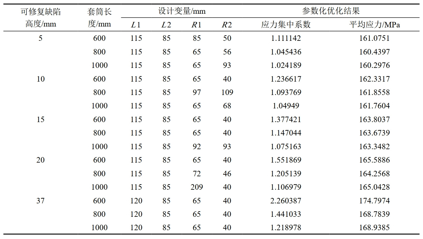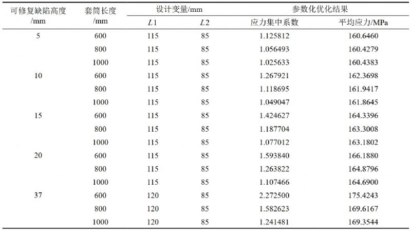 2.2 不同缺陷高度和套筒長(cháng)度的異型套筒優(yōu)化結果