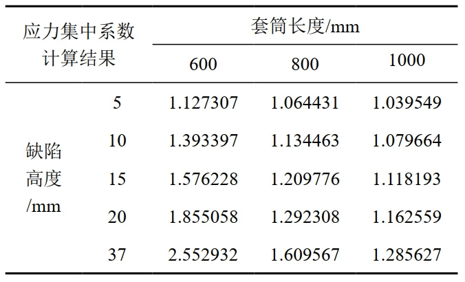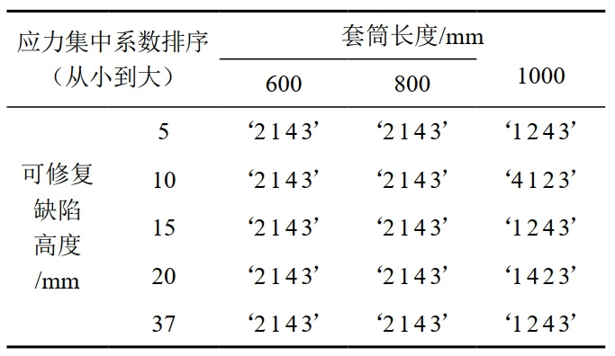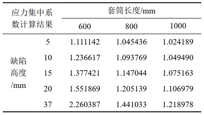 計算結果與直線(xiàn)導角型套筒類(lèi)似,即缺陷高度越大,應力集中系數越大,套筒應力儲備裕度越小。表 5所示的計算結果表明,Sigmond曲線(xiàn)型套筒可修復缺陷高度越大,套筒長(cháng)度越小,應力集中系數越大,相應的套筒應力儲備裕度越小。