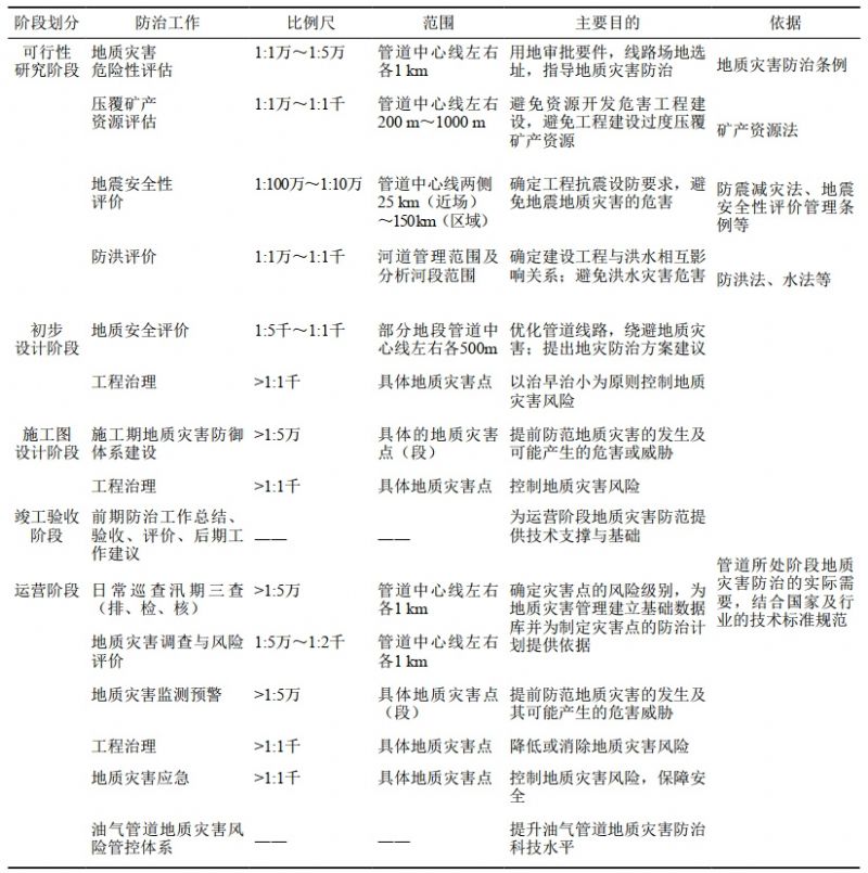 到2022年底,我國油氣管道總里程達18萬(wàn)千米,已基本形成連通海外、覆蓋全國、橫跨東西、縱貫南北、區域管網(wǎng)緊密跟進(jìn)的油氣管網(wǎng)布局!笆奈濉睍r(shí)期我國管道運輸仍將處于高速增長(cháng)期。與此同時(shí),近年來(lái)突發(fā)性強降水、臺風(fēng)等極端氣候事件增多,災害發(fā)生的概率加大,致使油氣管道面臨的地質(zhì)災害防治的總體形勢更加嚴峻。本文從油氣管道可行性研究、初步設計、施工圖設計、竣工驗收、運營(yíng)等五個(gè)階段入手,綜合研究油氣管道全生命周期誘發(fā)、加劇、遭受地質(zhì)災害威脅危害的可能性,避免和減少產(chǎn)生不良后果的基本方法,增強地質(zhì)災害防治的針對性、時(shí)效性和科學(xué)性,提高油氣管道建設及運行的地質(zhì)安全保障能力和水平(表1)。