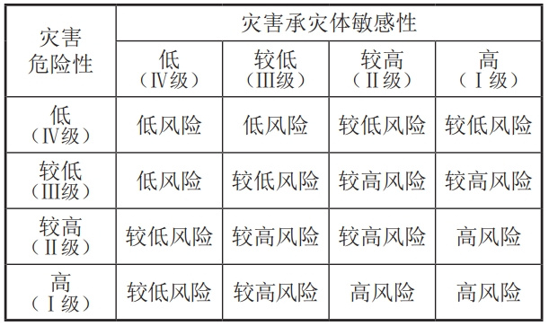 臺風(fēng)、風(fēng)暴潮、海浪等災害風(fēng)險評價(jià)。采用風(fēng)險矩陣方法將致災體危險性和承災體的敏感性進(jìn)行量化,由量化結果確定致災體的危險性等級和承災體的敏感性等級,災害的風(fēng)險等級由致災體的危險性等級和承災體的敏感性共同決定,見(jiàn)表 1。