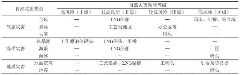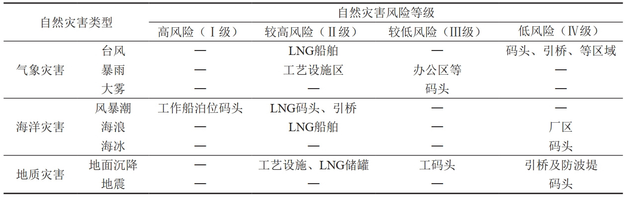 基于上述風(fēng)險評價(jià)方法,對LNG碼頭氣象災害、海洋災害、地質(zhì)災害進(jìn)行調查與風(fēng)險評價(jià),各類(lèi)自然災害風(fēng)險統一劃分成四級,分別為高風(fēng)險(I級)、較高風(fēng)險(II級)、較低風(fēng)險(III級)和低風(fēng)險(IV級),風(fēng)險評價(jià)等級結果詳見(jiàn)表 3。