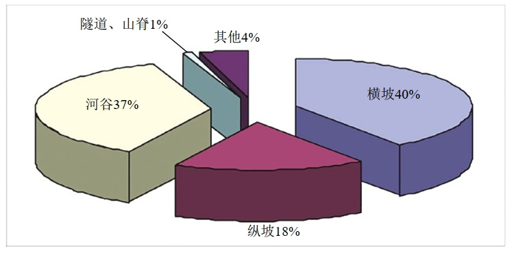 山區管道敷設方式可分為橫坡敷設段和縱坡敷設段,以澀寧蘭、蘭成渝、忠武和蘭鄭長(cháng)管道2005年至2010年排查出的4084處地質(zhì)災害為例,90%以上水毀災害發(fā)育在河道與山谷地區,崩滑流等其他災害則主要分布在山區橫坡敷設段(圖 1、圖 2)。