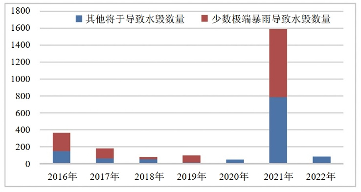 降雨是誘發(fā)地質(zhì)災害的主要因素。近年來(lái),北方地區極端降雨天氣頻發(fā),主要表現在降雨天數變少,暴雨天數增加,降雨越來(lái)越集中。經(jīng)統計,絕大多數的重大災情都是在臺風(fēng)等極端氣象情況下的降雨導致的,這也是近年來(lái)非常明顯的規律。通過(guò)對近幾年某公司汛期水毀情況的分析可以看出,少數極端暴雨導致的水毀數量占水毀總數量的一半以上(圖 4)。