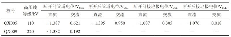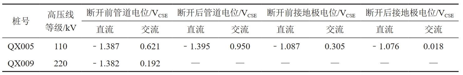 (3)測量管道位置及埋深前,對高壓輸電線(xiàn)路與管道交叉處的測試樁、固態(tài)去耦合器進(jìn)行了相關(guān)數據測試。由于該段管道投用了13套排流裝置,故測試點(diǎn)處接地體斷開(kāi)前后管道的交流電壓數值變化相差不大,具體測試數據如表5所示。