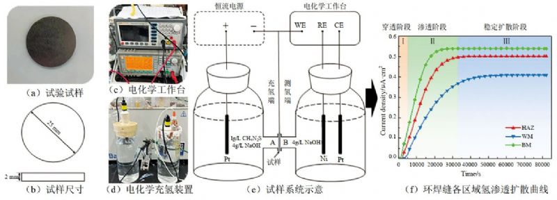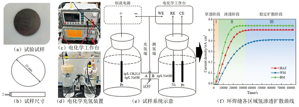 該試驗旨在深入分析管線(xiàn)鋼環(huán)焊縫區域的氫擴散特性,涉及母材、焊縫中心和熱影響區三個(gè)關(guān)鍵區域。在對各組織試樣進(jìn)行切割和研磨拋光后,通過(guò)氫滲透試驗研究環(huán)焊縫不同區域氫的擴散系數與表面吸附氫的濃度。在各區域沿管道壁厚方向制取直徑為25 mm,沿管道軸向厚度為2 mm的薄圓片試樣,用砂紙對圓片雙面進(jìn)行逐級打磨,直至2000#。為了防止試樣陽(yáng)極一側發(fā)生氧化反應產(chǎn)生非氫原子氧化產(chǎn)生的電流,將試樣的一側進(jìn)行鍍鎳處理。試驗結果表明,母材晶界的體積分數較大,可提供較寬的氫擴散通道,因此母材的有效擴散率最高;相比之下,熱影響區的氫擴散系數小于母材,表明在熱影響區存在較多氫陷阱,捕獲了部分氫原子,阻礙了氫的擴散;焊縫處的氫擴散系數最小,這是由于焊縫中的氫陷阱最多造成的(圖 1)。