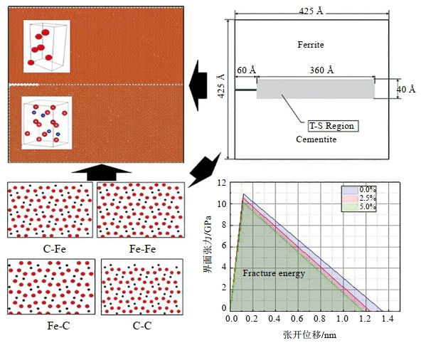 在微觀(guān)尺度下,主要通過(guò)分子動(dòng)力學(xué)模擬α-Fe由氫導致的韌性退化直至脆性斷裂的過(guò)程,分子動(dòng)力學(xué)模擬主要從原子層面研究材料在載荷作用下的力學(xué)行為,利用經(jīng)典運動(dòng)方程對一個(gè)系統中的N個(gè)原子或分子進(jìn)行逐步的數值求解。對于一個(gè)簡(jiǎn)單的原子系統,每個(gè)原子的動(dòng)力學(xué)過(guò)程由牛頓第二定律所控制。高鋼級管線(xiàn)鋼主要含鐵素體或由鐵素體與滲碳體組成的其他微觀(guān)組織。鐵素體具有體心立方點(diǎn)陣,而滲碳體具有正交晶格。鐵素體的強度和硬度相對較低,但其在塑性和韌性方面表現出色。在碳鋼和低合金鋼的熱軋(正火)和退火組織中,鐵素體占據主導地位。利用Atomsk建模軟件建立了尺寸為425 Å×425 Å×28.664 Å的鐵素體/滲碳體片層晶界結構,其中上層為鐵素體,下層為滲碳體(圖 2)。通過(guò)在模型中隨機摻入不同數量的氫原子模擬氫環(huán)境中晶界開(kāi)裂行為,此外還考慮了滲碳體四種不同終端(C-Fe、Fe-Fe、Fe-C、C-C)的影響。研究結果表明,隨著(zhù)氫原子濃度的增加,界面初始損傷對應的最大牽引力減小,臨界斷裂能也隨之降低,氫使得材料更易發(fā)生斷裂。