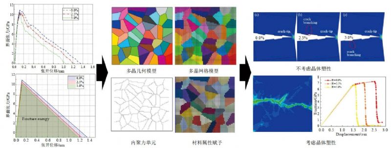 在細觀(guān)層次,泰森多邊形在建立多晶模型方面扮演了關(guān)鍵角色,每個(gè)泰森多邊形代表一個(gè)晶粒,其邊界相當于晶粒之間的界面。通過(guò)這種方式,利用泰森多邊形建?梢院(jiǎn)便地模擬和研究晶粒的大小、形狀和分布,這些都是影響材料性能的關(guān)鍵因素。例如,在金屬材料中,晶粒大小和分布直接影響材料的強度、塑性和疲勞壽命。除晶粒特征外,晶界同樣影響著(zhù)金屬材料的氫致開(kāi)裂行為。近幾年,由DUGDALE提出的內聚區模型被諸多學(xué)者用于模擬多晶模型的沿晶開(kāi)裂行為,晶界損傷參數可由微觀(guān)分子動(dòng)力學(xué)獲。▓D 3)。通過(guò)引入晶體塑性唯象本構用于表征多晶體在拉伸載荷作用下的塑性變形演化,使得結果更加真實(shí)可靠。模擬結果表明相同位移載荷下,氫使管材的啟裂時(shí)間提前,最終裂紋長(cháng)度增加。引入晶體塑性唯象本構后,模型應力呈不均勻分布,裂紋擴展路徑應力相對較大,且隨著(zhù)氫濃度的增加,材料由韌性斷裂轉變?yōu)榇嘈詳嗔选?o:p>