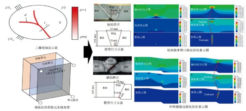 作為一種典型的彌散方法,相場(chǎng)法用一個(gè)標量場(chǎng),即相場(chǎng),描述尖銳裂紋拓撲。相較于XFEM、CZM,相場(chǎng)法避免了對不連續邊界的數值追蹤,并且不需要預估裂紋路徑。利用相場(chǎng)法建立焊縫根部燒穿缺陷與錯邊缺陷模型進(jìn)行模擬(圖 4),結果表明由于裂紋尖端處的靜水應力較高,隨著(zhù)裂紋的擴展,氫聚集于裂紋尖端處并且裂紋尖端的氫濃度出現了下降。此外,通過(guò)對比兩模型還可以發(fā)現,不同的缺陷類(lèi)型導致了裂紋擴展路徑的變化,模擬結果與實(shí)際相符。