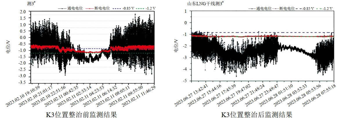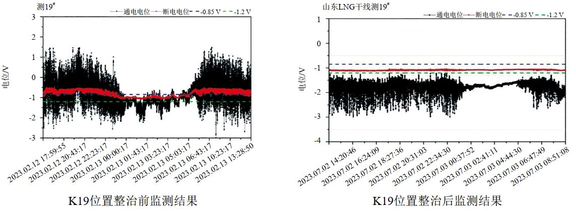 排流實(shí)施后,利用試片法對管道沿線(xiàn)進(jìn)行直流雜散電流復測,數據顯示管道電位波動(dòng)幅度明顯降低,其中K2處通電電位波動(dòng)由﹣4.364 V~4.06 V降低為﹣1.127 V~﹣3.318 V。管道斷電電位正于保護準則的比例均小于5%(圖 2),符合《AS 2832 Cathodic protection of metals Part1: pipes and cables》和GB 50991―2014要求,管道處于有效保護狀態(tài)。雜散電流整治效果評估完成后,在雜散電流整治區域安裝1處ER腐蝕速率探頭,利用腐蝕速率采集儀每年對ER腐蝕速率探頭的試片厚度進(jìn)行采集,根據壁厚減薄量持續監測管道的腐蝕速率,保證管道腐蝕情況安全受控。