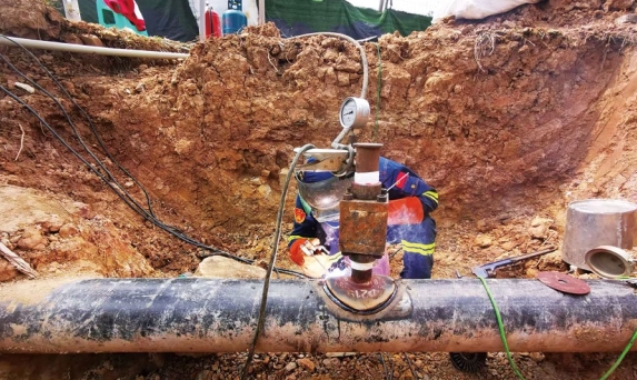 某機場(chǎng)在役Φ219 mm航空煤油管道設計壓力6.4 MPa,運行壓力3.5 MPa,全長(cháng)17.8 km、高程差240 m。某晚,管道在停輸回流狀態(tài)下出現壓力異常,3小時(shí)內管道靜壓下降了0.5 MPa,經(jīng)初步排查,排除溫差影響,認為管道壓降可能是因泄漏導致。為盡快排查壓降原因,管道管理單位聯(lián)合搶險單位利用補板式卡具排查輸油管道泄漏點(diǎn)工藝,進(jìn)行分段試壓,逐段縮小疑似泄漏點(diǎn)范圍,用時(shí)4天排查完全線(xiàn)管道,結合外防腐檢測、彈性波測漏技術(shù),成功找到了管道腐蝕泄漏點(diǎn),后采用帶壓焊接B型套筒方式完成管道修復。