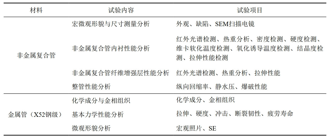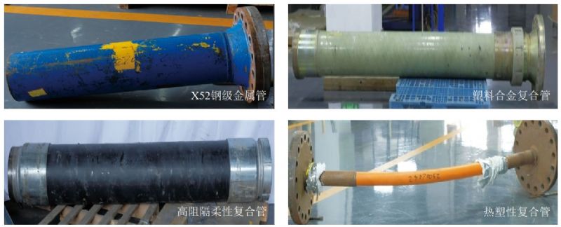開(kāi)展適應性試驗的管材有X52鋼級金屬管、高阻隔柔性復合管、塑料合金復合管、熱塑性復合管等(圖 2)。