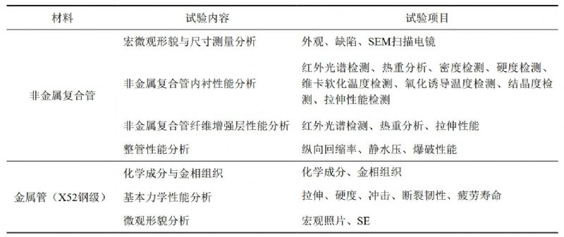 該研究以公司在役低鋼級油氣管道(X52鋼級)及非金屬管道為研究對象,開(kāi)展材料高壓充氫保壓前后的物理化學(xué)性能、力學(xué)性能測試表征研究(表 1),通過(guò)對比分析給出評價(jià)結果。