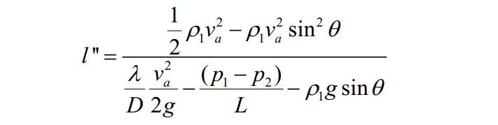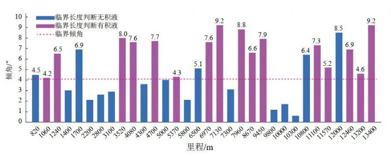 (1)評價(jià)方法優(yōu)化。本方法在NACE標準基礎上,針對臨界傾角法未考慮管道傾角處上坡段長(cháng)度以及在地形平坦地區應用效果較差的問(wèn)題,提出利用傾角處管道長(cháng)度進(jìn)一步判別該處是否可能積液。判別臨界長(cháng)度之前的步驟與NACE標準步驟相同,在間接評價(jià)得到臨界傾角后,對每個(gè)大于臨界傾角的位置進(jìn)行二次計算;贜ACE標準中臨界傾角的計算公式,經(jīng)過(guò)改進(jìn)后得到了本方法中臨界長(cháng)度ι''的表達式: