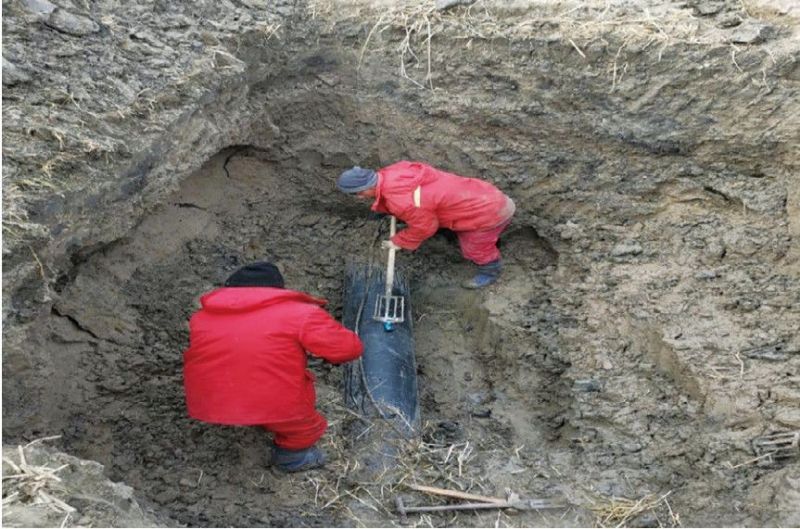 應用臨界長(cháng)度判斷易積液位置的結果圖如圖 1所示?梢(jiàn)全線(xiàn)共22個(gè)易積液位置(即易腐蝕點(diǎn)),采用臨界長(cháng)度公式,對所有易腐蝕點(diǎn)的積液可能性進(jìn)行再次判別,有5個(gè)大于臨界傾角的位置不會(huì )發(fā)生積液,并記錄其中一個(gè)里程位置820 m,作為開(kāi)挖驗證位置。