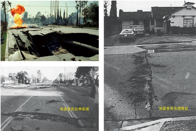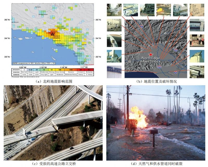 1994年1月17日凌晨4時(shí)31分,美國洛杉磯市西北200多公里的圣費爾南多谷的北嶺(Northrige)地區發(fā)生了6.6級地震,持續約30 s,造成斷層位錯產(chǎn)生地面裂縫以及大范圍的砂土液化和土壤破壞,并引發(fā)了11 000多起山體滑坡,造成1.1萬(wàn)余間房屋倒塌,震中30 km范圍內的高速公路、高層建筑被毀壞。穿越斷層的天然氣管道被拉斷,氣體泄漏引發(fā)火災近100處,燒毀上百幢住宅樓,從油田到煉油廠(chǎng)的輸油管道破裂,原油泄漏引發(fā)火災并污染河流,3條供水管道破裂后大量水流嚴重阻礙了市內交通,震中地區供氣供水中斷約7天(圖 1)。造成62人死亡,9000多人受傷,25萬(wàn)人無(wú)家可歸,財產(chǎn)損失達400多億美元[1]。