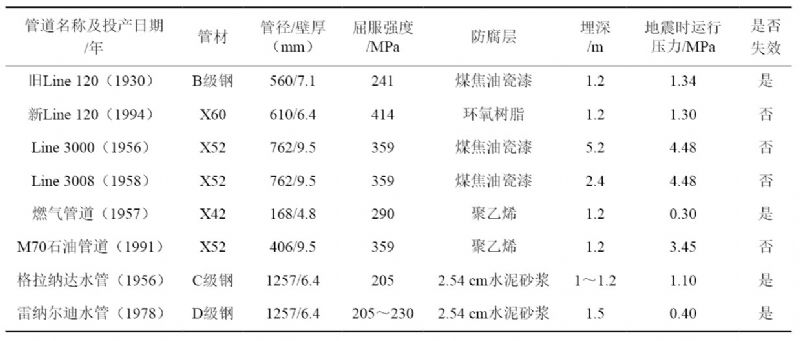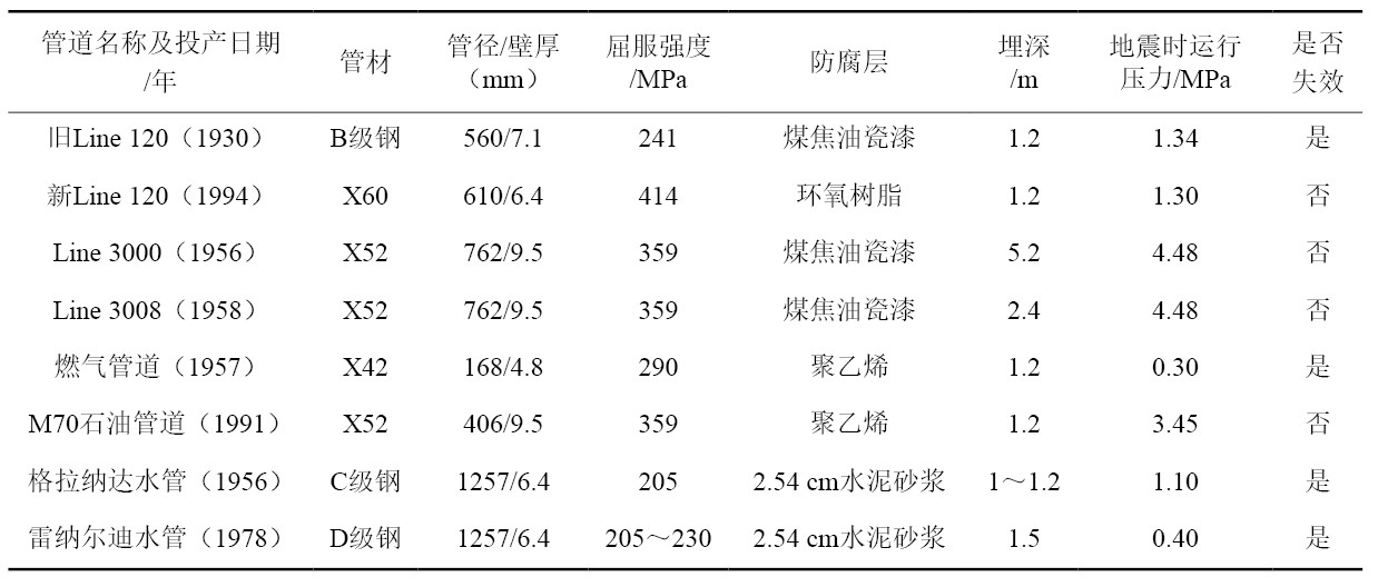 巴爾博亞大道是一條南北方向的街道,位于加利福尼亞南部圣費爾南多山谷北部,地震發(fā)生時(shí)在大道以北形成了一個(gè)約600 m×600 m的地震變形和地面失效區域。在最大拉伸變形區域有許多橫向地面裂縫,其上游約275 m~300 m處形成了一個(gè)最大壓縮變形區域,該區域可觀(guān)察到帳篷狀的隆起(圖 2)。沿該大道共敷設了8條管道(表 1),地震導致1條高壓輸氣管道、1條燃氣管道和2條高壓輸水管道破裂,另外4條管道未受損,受損管道均發(fā)生在最大拉伸和壓縮變形區域[2]。