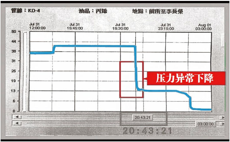 1974年至1979年間,臺灣有關(guān)部門(mén)為了改善基礎設施及實(shí)現產(chǎn)業(yè)升級,進(jìn)行了十大基礎設施建設,高雄區成為發(fā)展石化等重工業(yè)的重鎮。市區道路下方埋設了復雜的石化管線(xiàn),與市政建設的水電設施交錯在一起,就此埋下了隱患。此次氣爆的范圍擴及2~3公里范圍內的多個(gè)街道,這是因為當丙烯發(fā)生泄漏時(shí),第一時(shí)間到場(chǎng)的消防隊、石化企業(yè)及市政建設主管部門(mén)都無(wú)法精確掌握管線(xiàn)設施的基本情況,泄漏的丙烯氣體隨著(zhù)地下排水箱涵流竄至多個(gè)街道,隨后陸續觸及火花而接連引爆。災后調查發(fā)現,泄漏發(fā)生時(shí),使用該管線(xiàn)輸送丙烯的供應及接收企業(yè)已察覺(jué)到輸送過(guò)程有不正常的壓力下降(圖 3),但卻不明究理而持續輸送,更加劇了爆炸的規模,不僅炸翻多條路面,甚至將路邊停放的汽車(chē)炸飛至三樓頂,直接財產(chǎn)損失數十億臺幣以上。后續衍生的問(wèn)題還包括:民眾對地下石化管線(xiàn)莫名的恐懼與抗爭,石化產(chǎn)業(yè)發(fā)展停滯且面臨存廢的挑戰,以及地方政府與上級石化監管權責的爭議不休。
