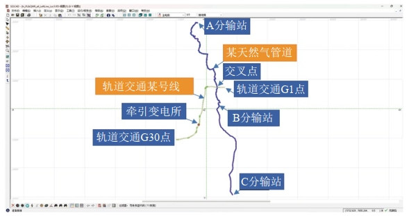基于CDEGS計算軟件建立交流干擾源與管道相對位置的模型,輸入干擾源與管道參數,進(jìn)行模擬計算分析從而得出所需結果。根據實(shí)際情況建立計算模型(圖 1),整個(gè)模型中包括了軌道交通和管道系統實(shí)際路由。模型采用的各參數均基于實(shí)際資料選取,從而可以準確反映現場(chǎng)實(shí)際情況。