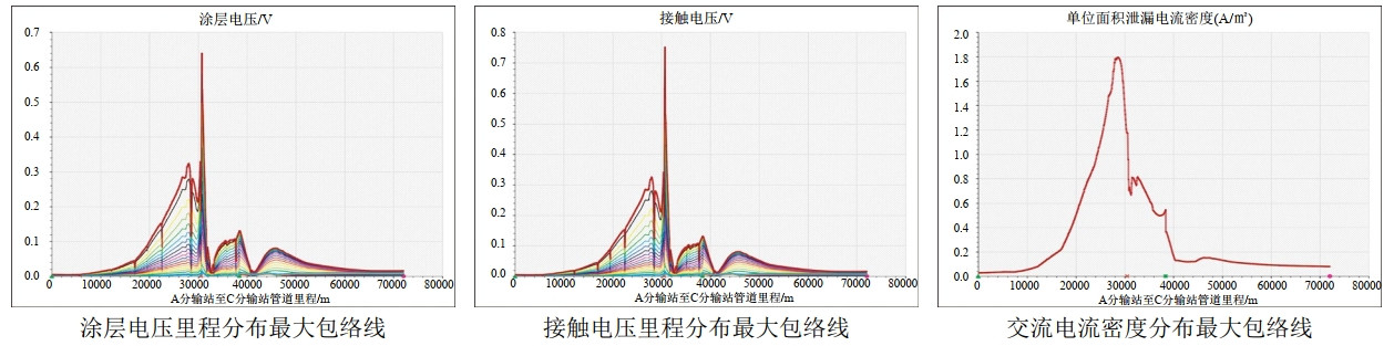 (1)雙線(xiàn)多車(chē)正常運行情況。當該軌道上下行方向雙線(xiàn)各有10輛車(chē)在運行的情況下,管道沿線(xiàn)最大交流干擾電壓為2.999 V,管道沿線(xiàn)最大涂層電壓為3.594 V,地面可接觸物體(如測試樁、閥室等)的最大接觸電壓為4.218 V,均未超過(guò)安全限值。流過(guò)1 cm²缺陷孔的最大泄漏電流密度為10.615 A/m²,交流腐蝕風(fēng)險為低。