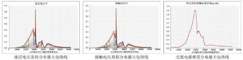 軌道交通下行方向單線(xiàn)單車(chē)行駛。管道沿線(xiàn)最大交流干擾電壓為0.510 V,管道沿線(xiàn)最大涂層電壓為0.631 V,地面可接觸物體(如測試樁、閥室等)的最大接觸電壓為0.74 V,均未超過(guò)安全限值。流過(guò)1 cm²缺陷孔的最大泄漏電流密度為1.805 A/m²,低于30 A/m²,交流腐蝕風(fēng)險為低。