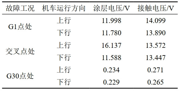 軌道交通上、下行方向,接觸線(xiàn)與鐵軌短路故障在三種不同點(diǎn)位時(shí),計算出埋地管道沿線(xiàn)最大涂層電壓及地面可接觸物體(如測試樁、閥室等)的最大接觸電壓(表 1)。三種故障工況下,埋地管道沿線(xiàn)最大涂層電壓均遠小于安全限值5 kV標準,地面可接觸物體(如測試樁、閥室等)的最大接觸電壓也均未超過(guò)安全限值584.47 V。