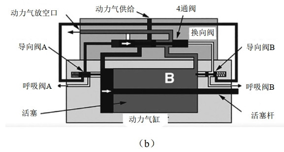 動(dòng)力氣供給通過(guò)“4通閥”流道進(jìn)入動(dòng)力氣缸“B”腔,推動(dòng)活塞往左運動(dòng)(圖 1 a)。當活塞運動(dòng)到左側極限時(shí),活塞頂開(kāi)“導向閥A”,使動(dòng)力氣沿著(zhù)“導向閥A”流道進(jìn)入“4通閥”左側閥腔內,推動(dòng)閥芯(黑色)向右運動(dòng),導通左側動(dòng)力氣放空口,封閉右側動(dòng)力氣進(jìn)口,動(dòng)力氣通過(guò)左側放空口泄放。