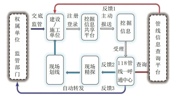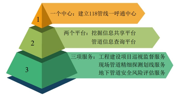 (1)搭建一呼通平臺。平臺總體業(yè)務(wù)架構為一個(gè)中心、兩個(gè)平臺、三項服務(wù)的“1+2+3”模式(圖 1)。一個(gè)中心即118一呼通中心,負責建立政府部門(mén)、建設單位、施工單位、權屬單位的工作聯(lián)系溝通平臺。兩個(gè)平臺即建立挖掘信息共享平臺、管道信息查詢(xún)平臺,共享平臺實(shí)現上報工程信息及共享、溝通、監督執行過(guò)程、形成處理結果,查詢(xún)平臺實(shí)現全域管道數據查詢(xún)和數據共享。三項服務(wù)即針對政府監管部門(mén)提供平臺報備、管道資料、現場(chǎng)交底、防護措施等服務(wù),針對建設單位、施工單位、權屬單位,提供現場(chǎng)挖掘、施工詳查、開(kāi)挖劃線(xiàn)、保險理賠等服務(wù),針對其他相關(guān)單位,提供隱患排查、定期巡查、安全評估、防護咨詢(xún)等服務(wù)。