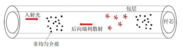 由于光纖在拉絲制作生產(chǎn)過(guò)程中存在著(zhù)質(zhì)量、密度等參數的不均勻分布,從而導致光在光纖中傳播時(shí)會(huì )發(fā)生散射現象。光在光纖中的散射方向為隨機分布,其中一部分散射的光會(huì )沿著(zhù)入射光相反的方向傳播,故稱(chēng)之為后向散射。光纖的后向散射根據散射因素的不同可分為瑞利散射、布里淵散射和拉曼散射。其中DAS主要應用光纖的后向瑞利散射實(shí)現。