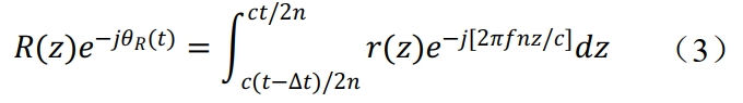 式中c為光速,m/s;t為時(shí)間,s;∆t為脈沖寬度,n為光纖折射率,f 為光纖激光器輸出頻率,Hz;z為散射點(diǎn)距離,m;r(z)代表光纖距離z處的離散點(diǎn)反射率。瑞利后向散射光與本振光參考光通過(guò)2×2耦合器進(jìn)行相互混頻,經(jīng)由平衡光電探測器將光信號轉化為電信號。光電探測器輸出信號可表示為: