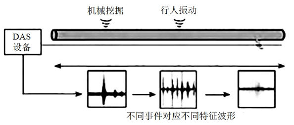 分布式光纖聲波傳感器(Distributed Fiber Acoustic Sensing,簡(jiǎn)稱(chēng)DAS)利用管道同溝鋪設的光纖,通過(guò)探測脈沖光在光纖中的瑞利散射的相位變化測量光纖受到的振動(dòng),從而實(shí)現對管道周邊振動(dòng)事件(如第三方施工、管道泄漏、人為破壞等)的及時(shí)感知。該技術(shù)具有以下特點(diǎn):一是無(wú)需重新鋪設新的光纜,原同溝敷設的通信光纜便可進(jìn)行測量;二是探測距離長(cháng),靈敏度高,感知精度高,能實(shí)現全天候在線(xiàn)監測;三是成本低,安裝方便,不受電磁干擾。