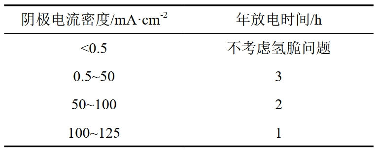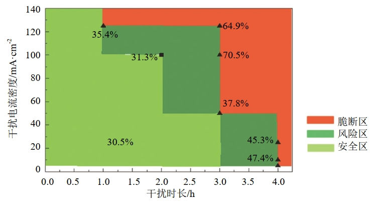 獲得高壓直流干擾電參數、環(huán)境因素等對氫脆的影響規律,確定放電時(shí)不同電流密度下,接地極年放電時(shí)間的限制,形成高壓直流干擾氫脆控制安全邊界(表 2、圖 2),當干擾時(shí)長(cháng)和干擾電流位于圖譜紅色區間時(shí),X80鋼具有氫脆風(fēng)險。