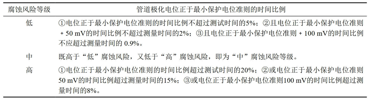 基于極化電位的評判指標:交流電流密度低于30 A/m²時(shí),電位應為﹣0.85 V~﹣1.10 V之間;交流電流密度在30 A/m²~100 A/m²時(shí),電位應在﹣0.95 V~﹣1.10 V之間。