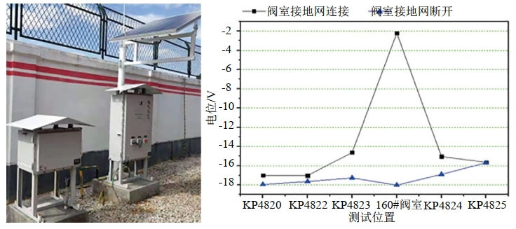 線(xiàn)路管道采取絕緣接頭分段和鋅帶排流的防護方案,有效降低了管道沿線(xiàn)干擾電壓和腐蝕速率。在站場(chǎng)閥室研發(fā)了大功率排流器,實(shí)現了管地間高電壓等電位處理。排流器最大排流量可達240 A,并具備管地電壓自動(dòng)監測和超壓時(shí)等電位連接功能,可消除站場(chǎng)閥室放電燒蝕風(fēng)險,F場(chǎng)實(shí)施后有效降低了站場(chǎng)閥室燒蝕和線(xiàn)路管道腐蝕風(fēng)險(圖 3~圖 5)。