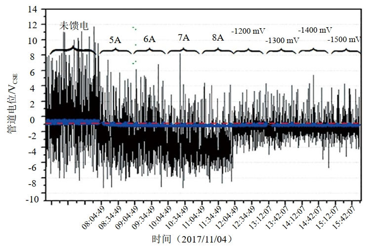 對地鐵等動(dòng)態(tài)直流干擾采用強制電流陰極保護和極性排流聯(lián)合防護方式,有效減少雜散電流流入,全線(xiàn)電位水平均得到改善。陰保系統在恒位、恒流工作模式下,通電電位波動(dòng)幅值減小,斷電電位明顯負向偏移,陰極保護有效(圖 6)。