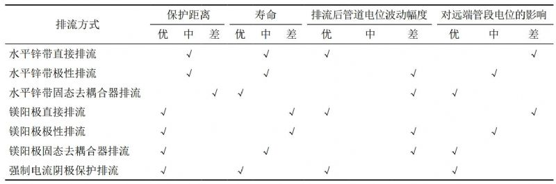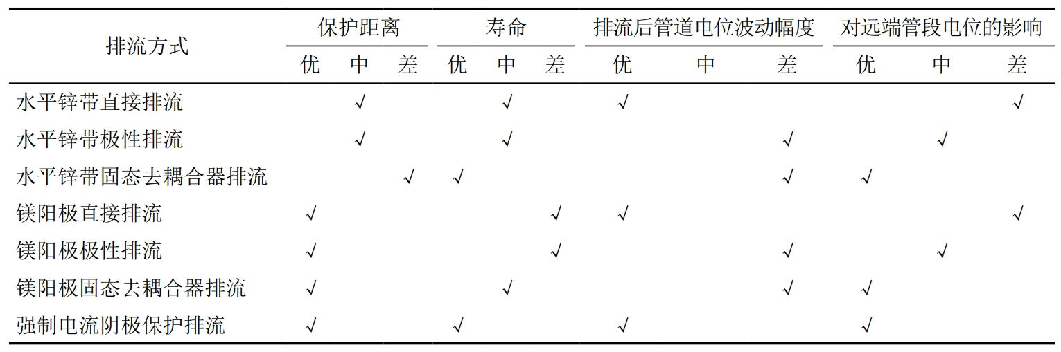 采用現場(chǎng)排流試驗測試研究了不同排流地床和排流器組合下的排流效果,明確了交直流交互作用工況下有效的緩解措施及其作用范圍,強制電流陰極保護排流可在較長(cháng)距離范圍內有效抑制動(dòng)態(tài)直流干擾,對于動(dòng)態(tài)直流干擾治理效果最佳,但對于交流干擾改善不理想。犧牲陽(yáng)極接地排流不適合動(dòng)態(tài)正向干擾強度高的情況下,犧牲陽(yáng)極接地排流可在有限的范圍內對交流和直流干擾有一定程度的緩解。其中鋅帶直接排流時(shí)管道保護效果較差,而采用鎂帶直接排流時(shí)管道陰極保護全時(shí)刻達標。排流地床不同連接方式時(shí),直接排流的效果優(yōu)于極性排流,極性排流優(yōu)于固態(tài)去耦合器排流。三種連接方式下,遠端管道電位均無(wú)正向偏移;讷@得的防護措施適用性和有效作用范圍研究成果,明確了單一的排流方式均存在一定的弊端,在實(shí)際的工程應用中應根據實(shí)際需求針對性選用綜合控制措施,確保排流效果(表 4)。