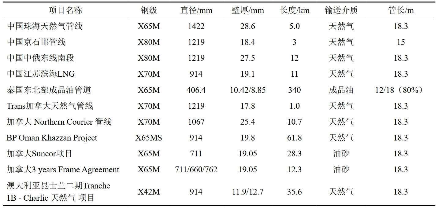 據統計,天然氣管道發(fā)生泄漏的首位失效因素為環(huán)焊縫破裂,占比約45%。而降低環(huán)焊縫失效概率最簡(jiǎn)單有效的辦法就是減少環(huán)焊縫數量。國家管網(wǎng)集團油氣管道安全高效建設關(guān)鍵技術(shù)研究項目結果表明:18 m加長(cháng)鋼管與12 m鋼管相比,可減少1/3的環(huán)焊縫數量,同時(shí)降低20.38%的施工費用。近年來(lái)加長(cháng)管在國內外管道建設中都有應用(表 1)。