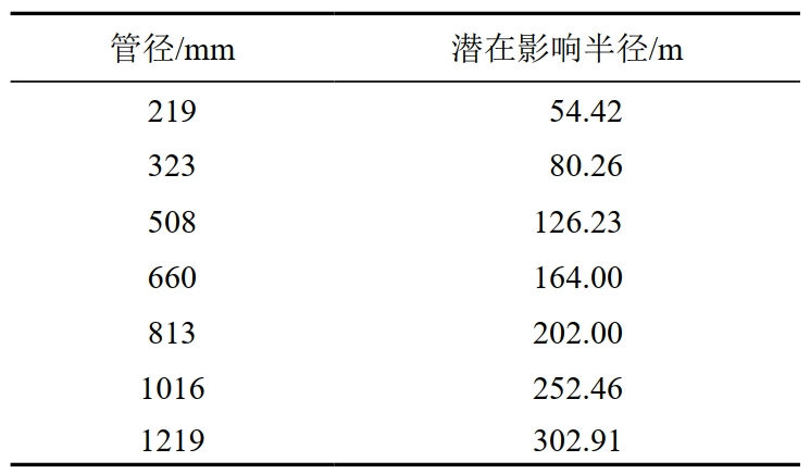 表 1 同一設計壓力不同管徑潛在影響半徑