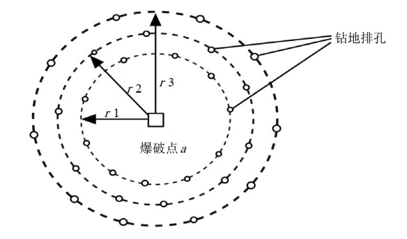 (2)實(shí)施方法。在距離爆破點(diǎn)一定半徑的軌跡上,按照一定間距和密度對地打孔,以及變化半徑多層次錯位打孔,類(lèi)似于豎井作業(yè)過(guò)程中的圍幕注漿法。根據現場(chǎng)條件和保護要求,可以采取全環(huán)打孔或局部方向弧線(xiàn)打孔(圖 1)。