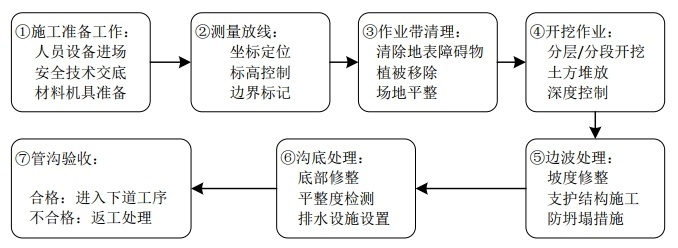 管溝開(kāi)挖主要包括施工準備、測量放線(xiàn)、作業(yè)帶清理、開(kāi)挖作業(yè)、邊坡處理、底部處理和管溝驗收等環(huán)節(圖 1)。