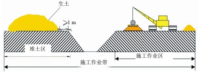 (3)規范管溝開(kāi)挖工藝流程,開(kāi)挖期間需要不斷監測土壤穩定性和周邊環(huán)境變化,并注意土方堆土符合GB 50369―2014《油氣長(cháng)輸管道工程施工及驗收規范》要求,堆土距離溝邊不應小于1米(圖 3)。邊坡處理應符合GB 50369―2014要求的邊坡坡度。底部處理需清除松散土壤、平整底部以及設置必要的排水設施。管溝驗收要確保管溝尺寸、形狀和質(zhì)量符合設計要求和施工標準。