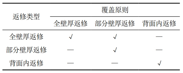 2023版規定了二次返修需單獨進(jìn)行焊接工藝評定,還規定了全壁厚返修、部分壁厚返修和背面內返修三種返修類(lèi)型,以及不同返修類(lèi)型的覆蓋規則,如表 5所示。