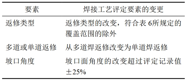 返修焊的焊接工藝評定基本要素,除符合手工焊和半自動(dòng)焊的基本要素,還應符合表 6的規定。評定合格的對接焊縫返修工藝,適用于支管焊縫和角焊縫的返修焊接。二次返修評定合格的返修工藝,適用于一次返修焊接。