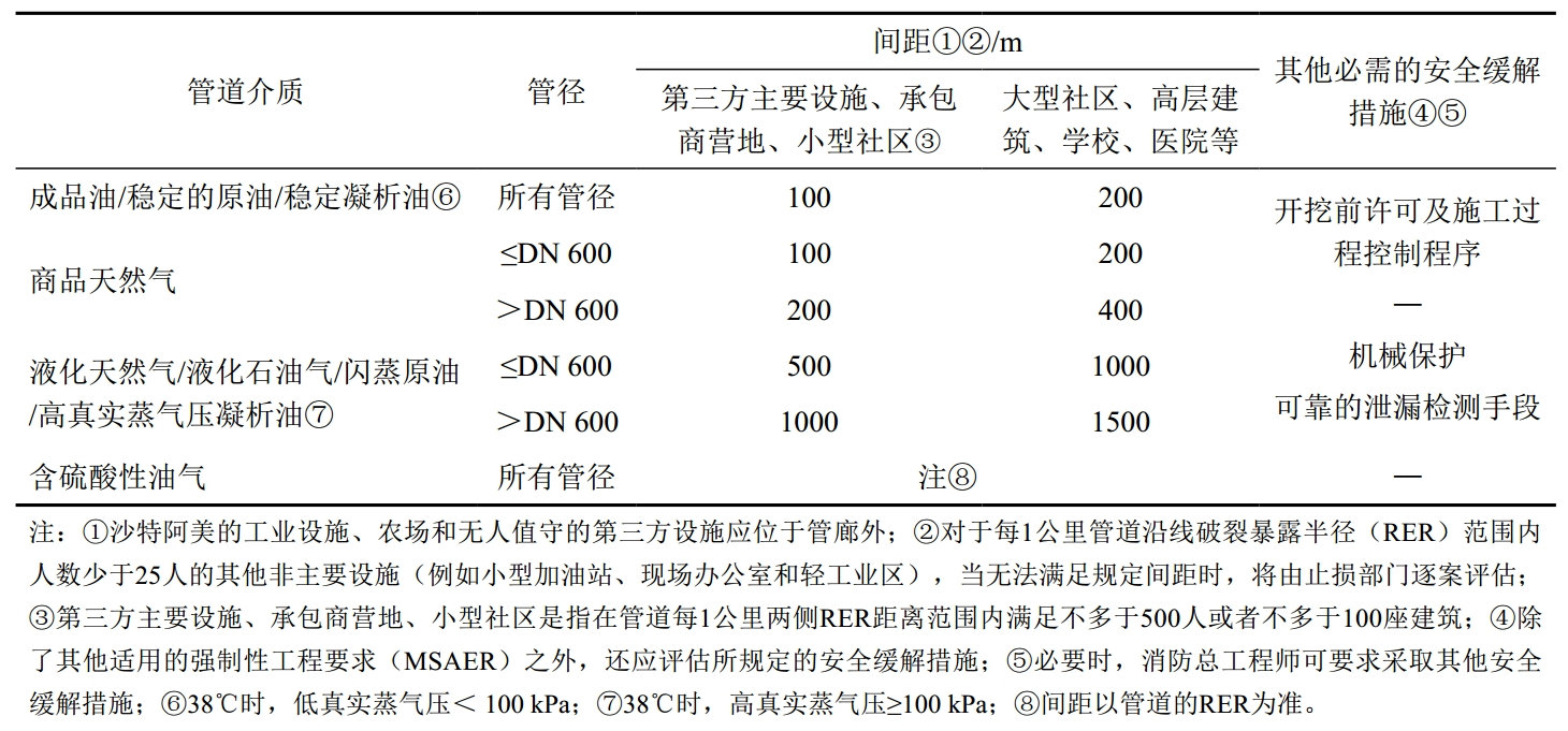 對于管道與居民社區、商業(yè)區、工業(yè)區、辦公區、學(xué)校醫院及大型活動(dòng)場(chǎng)館等建構筑物和設施的間距,根據不同地區等級及建構筑物規模等在安全設計專(zhuān)篇規范中作出明確間距要求及列明間距表,或給出可直接引用的簡(jiǎn)易計算公式,方便指導管道設計及項目驗收工作。
