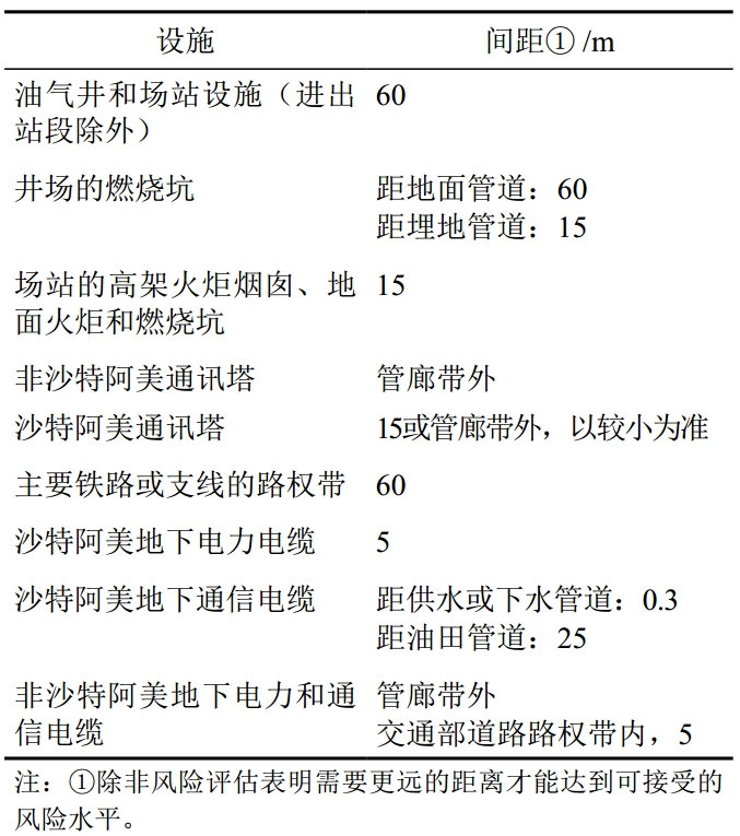 管道及電力線(xiàn)、通信線(xiàn)作為線(xiàn)性工程有共同的特點(diǎn),在野外多沿公路敷設,在城郊鋪設在經(jīng)過(guò)規劃的廊帶。新建油氣管道多數會(huì )并行或交叉穿越這些服務(wù)設施,因此與這些設施的間距要求也是各類(lèi)規范的關(guān)注重點(diǎn)。沙特阿美SAES-B-064作為管道設計及施工的安全專(zhuān)篇規范,匯總規定了關(guān)于油氣管道與不同設施的間距要求,有利于設計及施工技術(shù)人員集中參考。