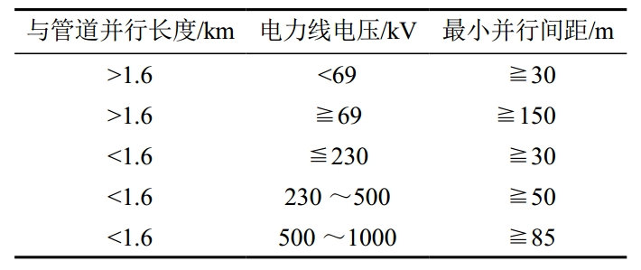 2)管道與架空通信線(xiàn)纜的間距要求:管道與已建架空通信桿、電纜之間的最小水平間距為15 m,最小垂直凈間距為9.0 m(從地面測量)。