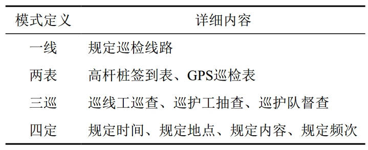 (1)人巡模式。在巡檢通道建立的基礎上,實(shí)行“定量化”與“差異化”相結合的混合巡護模式。常規線(xiàn)路、常規時(shí)間實(shí)行“定量化”巡護辦法,實(shí)行“一線(xiàn)、兩表、三巡、四定”巡護模式(表 1);關(guān)鍵部位和特殊時(shí)期實(shí)行“差異化”巡護辦法,將巡護公里數和巡護頻次等直接與個(gè)人績(jì)效獎金掛鉤,做到多勞多得、按勞取酬,實(shí)現了管道巡護時(shí)間上、內容上和責任上的全覆蓋。